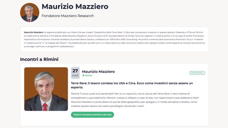 Ci vediamo a Rimini il 27 marzo: Terre Rare: il tesoro conteso tra USA e Cina. Ecco come investirci senza essere un esperto.