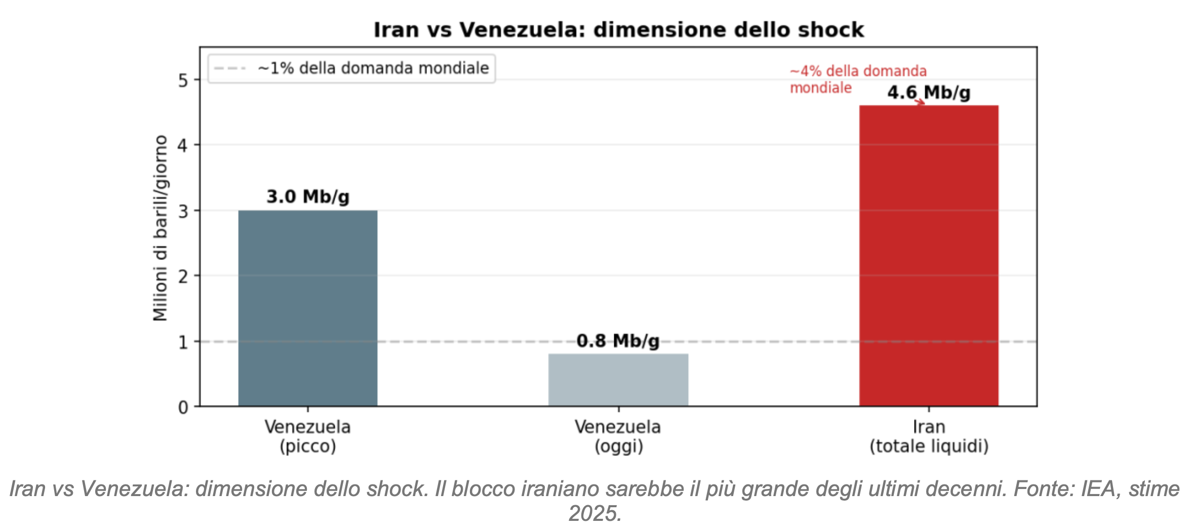 L’Iran è un’altra storia. Produce circa 3,3 milioni di barili al giorno di grezzo, più 1,3 milioni di condensate e altri liquidi: totale vicino a 4,6 milioni di barili al giorno. Con una domanda globale intorno ai 104 milioni, l’Iran vale circa il 4,5% dell’offerta mondiale — quattro volte il problema Venezuela nel momento peggiore.