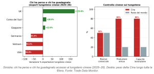 Giappone e Corea del Sud insieme ora coprono quasi metà di tutte le esportazioni cinesi di tungsteno — accesso preferenziale che Pechino ha usato in altri casi per premiare chi gli sta vicino e punire chi non gli piace. Non è un caso. È una scelta precisa.
