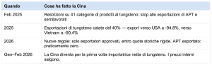 Da febbraio 2025 la Cina ha smesso di fare il controllo passivo e ha cominciato ad agire. Il Ministero del Commercio ha bloccato le esportazioni su 41 categorie di prodotti al tungsteno. Nel 2025 le esportazioni totali sono calate del 40%. Nel 2026 le nuove regole hanno limitato ulteriormente gli invii, ammettendo solo esportatori approvati e dentro quote storiche rigide.