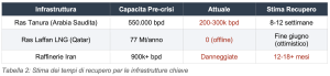 Capacità di raffinazione persa: 300.000-400.000 bpd. Stoccaggio perso: 40-50 milioni di barili di capacità eliminata.